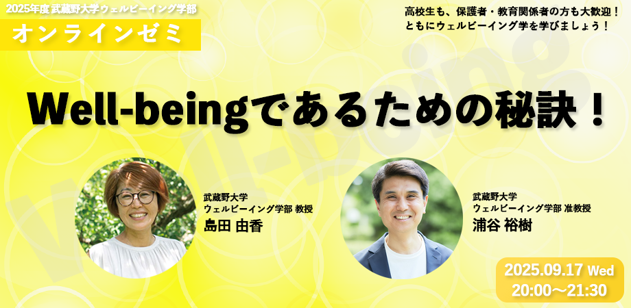 今回のオンラインゼミでは、教員の島田由香さん、浦谷裕樹さんをお迎えし、自分や自分の周り、そして、これからの社会がWell-beingであるための秘訣をお話いただきます!