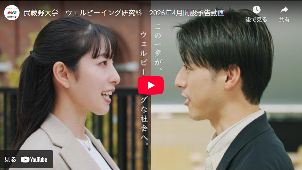 News ウェルビーイング研究科 2026年4月開設予告動画ができました! by muwb 2026年2月9日 2026年2月9日 20 制作club50のプレスリリースはこちら 0 FacebookTwitter previous post 中村一浩教授の新著が発売になりました You may also like 中村一浩教授の新著が発... 2026年2月4日 前野隆司教授の新著が発... 2026年1月14日 武蔵野大学大学院 ウェ... 2025年12月31日 ☆山﨑かれんさんからの... 2025年11月22日 武蔵野大学大学院 ウェ... 2025年9月30日 武蔵野大学大学院ウェル... 2025年8月29日 オープンキャンパス参加... 2025年8月20日 オープンキャンパス参加... 2025年8月20日 武蔵野大学大学院 ウェ... 2025年8月11日 インスタグラムを始めま... 2025年8月6日