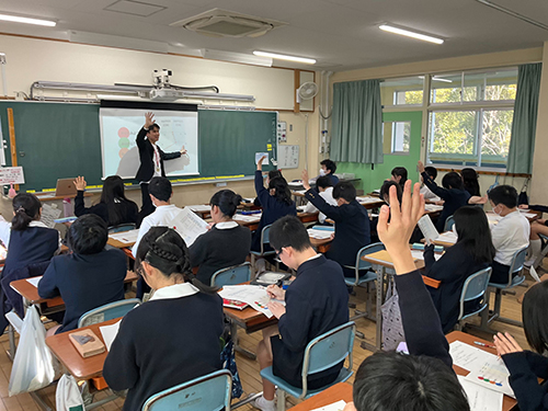 クラスごとに前半は日本におけるウェルビーイングの現状と基礎的な理論の説明、後半は事前に回答してもらっていた「幸せの4因子チェックシート」の解説後、班ごとに分かれて「幸せ対話」をしました。